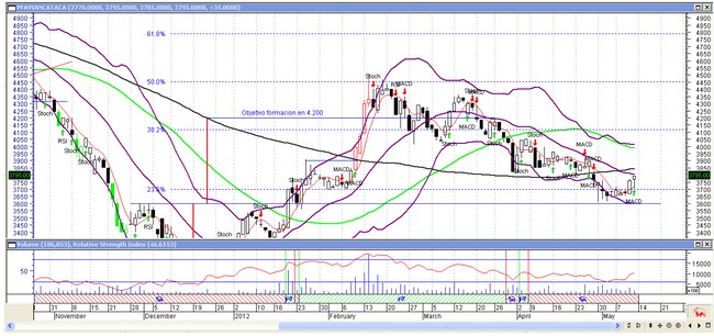 La grafica semanal, confirma soporte en los $ 3.700 y parece animar compradores porque cierra con una vela envolvente, que niega la anterior y cierra justo en la media de 5 periodos de color rojo línea delgada. Este marco de tiempo confirma la apariencia técnica de ser un mínimo mayor en formación la cual tendría como objetivos técnicos al alza las medias de 20($3.890), una directriz bajista azul de largo plazo sobre los $4.000 y der superarse este ultimo podríamos estar viendo nuevamente precio muy cerca del máximo anterior el cual seguramente de darse en el mediano plazo, será nuevamente zona de toma de utilidad. En el escenario menos favorable un cierre semanal debajo de los $ 3.700 prendería las alarmas que el movimiento alcista contra tendencia podría fallar, en caso tal sería muy importante tener los STOP ajustados un poco debajo de este valor.