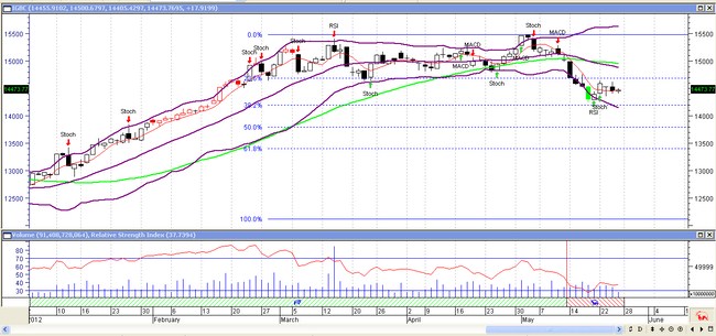 La semana inicia con recuperación que nos llevaron a pensar que podría recuperarse el antiguo canal de consolidación en los 14.700 puntos,  pero el impulso no fue suficiente. Por lo pronto tenemos un soporte corto plazo sobre los 14.200 puntos y la resistencia en sobre la base del canal en los 14.700 puntos. Recuperar este canal seria importante en el sentimiento de los inversionistas.