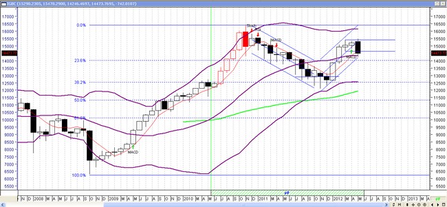 El marco mes, nos muestra un Mayo muy bajista, se evidencia la ruptura a la fecha del canal lateral corto plazo, pero se detiene en la media de 20 meses.;  Importante nivel de soporte largo plazo que sin duda marcará la pauta de para donde se dirige el índice en los próximos meses. Mientras se respete este nivel podemos a pesar de lo pronunciado de la corrección, afirmar que la tendencia primaria largo plazo sigue alcista y que estamos ante un mínimo mayor en formación para este marco de tiempo.  La ruptura de este nivel y de los 14 mil puntos a la baja, negaría esta hipótesis, mientras que un cierre en próximos meses en nivel superior al máximo anterior es decir, un cierre arriba de 15.480 puntos, lo confirmaría.