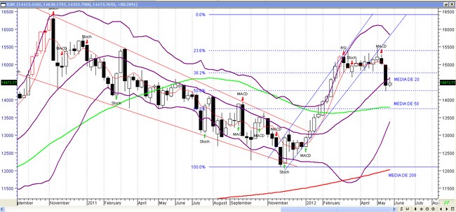El marco semanal (Ver gráfica) la vela nos muestra el impulso al inicio de semana y el movimiento se detiene justo en la media de 20 (14.640), la cual sirvió de resistencia y se posiciona como el primer nivel técnico a superar. El soporte sigue siendo el Fibonacci 50% largo plazo, pero deja abierta la posibilidad de no respetarse este nivel de 14.250 de bajar a buscar la media de 50 Verde y soporte Fibo 62% en los 13.780 puntos.