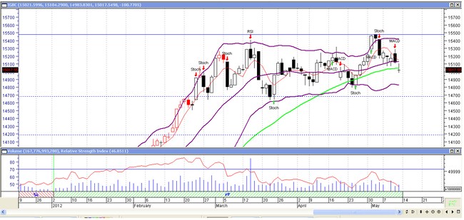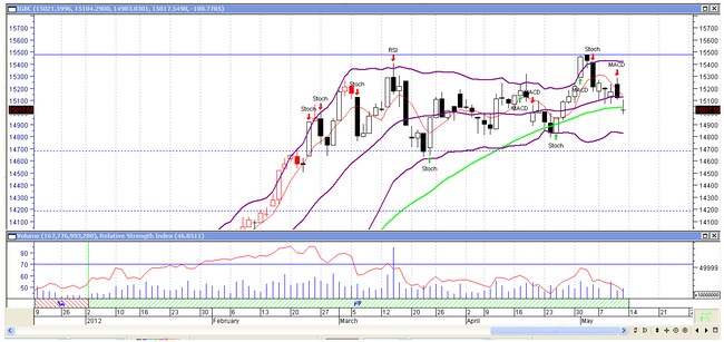 Resistencias de corto plazo sobre 15.100 y 15.200 y soporte sicológico en nivel de 15.000 puntos, que esperamos se mantenga para el cierre de la siguente semana, de lo contrario podríamos buscar niveles 14.830 puntos nuevamente.