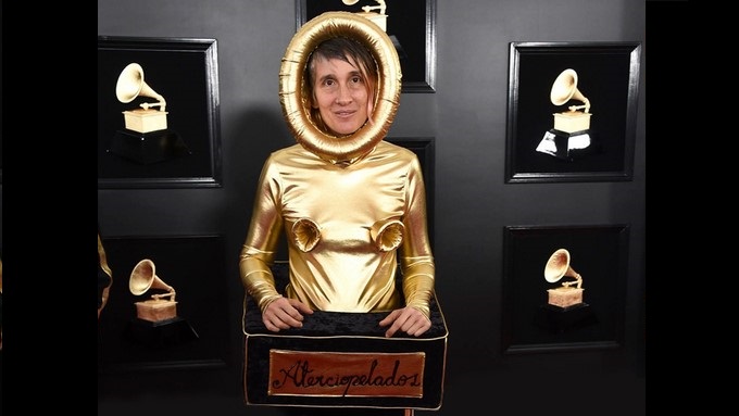Y es que la colombiana se disfrazó de gramófono para pasar por la alfombra roja de los premios que se realizaron el pasado 10 de febrero en Los Ángeles, Estados Unidos.
