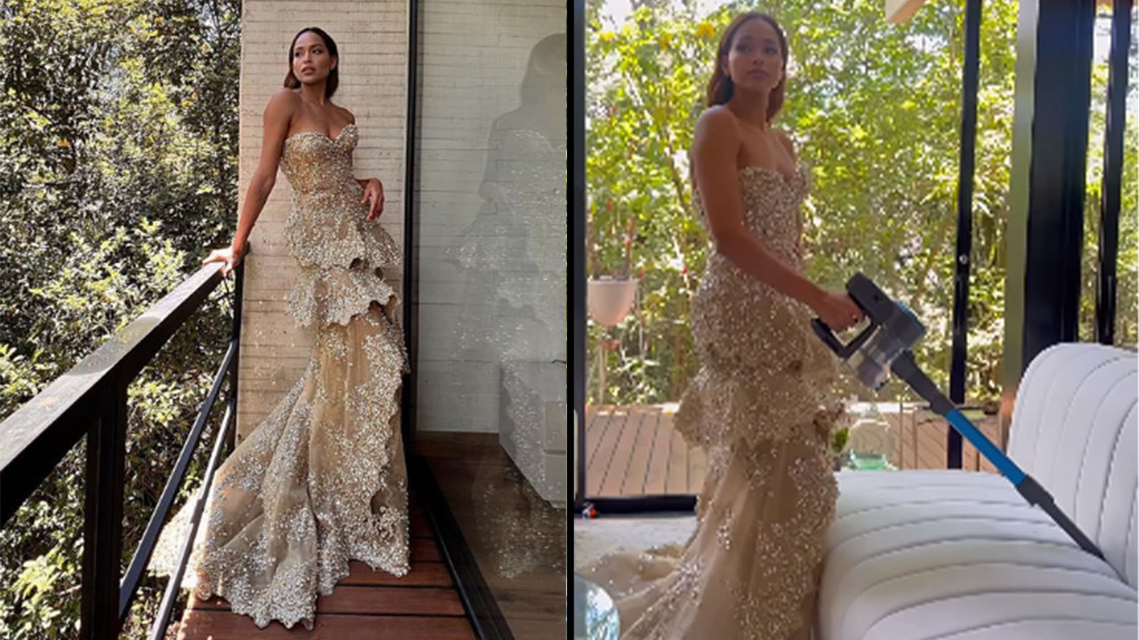“Tan caro que fue como para tenerlo guardado”, escribió la exreina Colombia en un video en el que se puede ver usando su vestido nuevamente mientras terminaba tareas del hogar, como organizar los juguetes, limpiar los muebles, regar las plantas y hasta saludando a los vecinos.