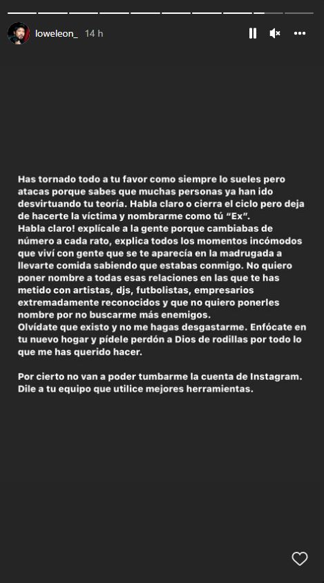 “Nuevamente la historia mal contada por Caperucita (…) Le prometiste a Dios dejar atrás la brujería para ser una nueva persona y eso lo tienes tatuado en el cuerpo”, inició el mensaje de León,