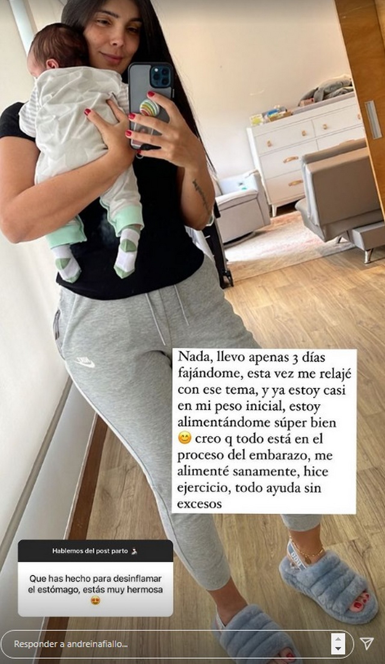 Una de las internautas le preguntó cuantos kilos había subido por lo que Andreina Fiallo aseguró “subí 14, ya solo me quedan 3”. Además, afirmó que no se ha hecho nada, por el momento, para desinflamar su abdomen. “Nada, llevo apenas 3 días fajándome, esta vez me relaje con ese tema”, aseguró.