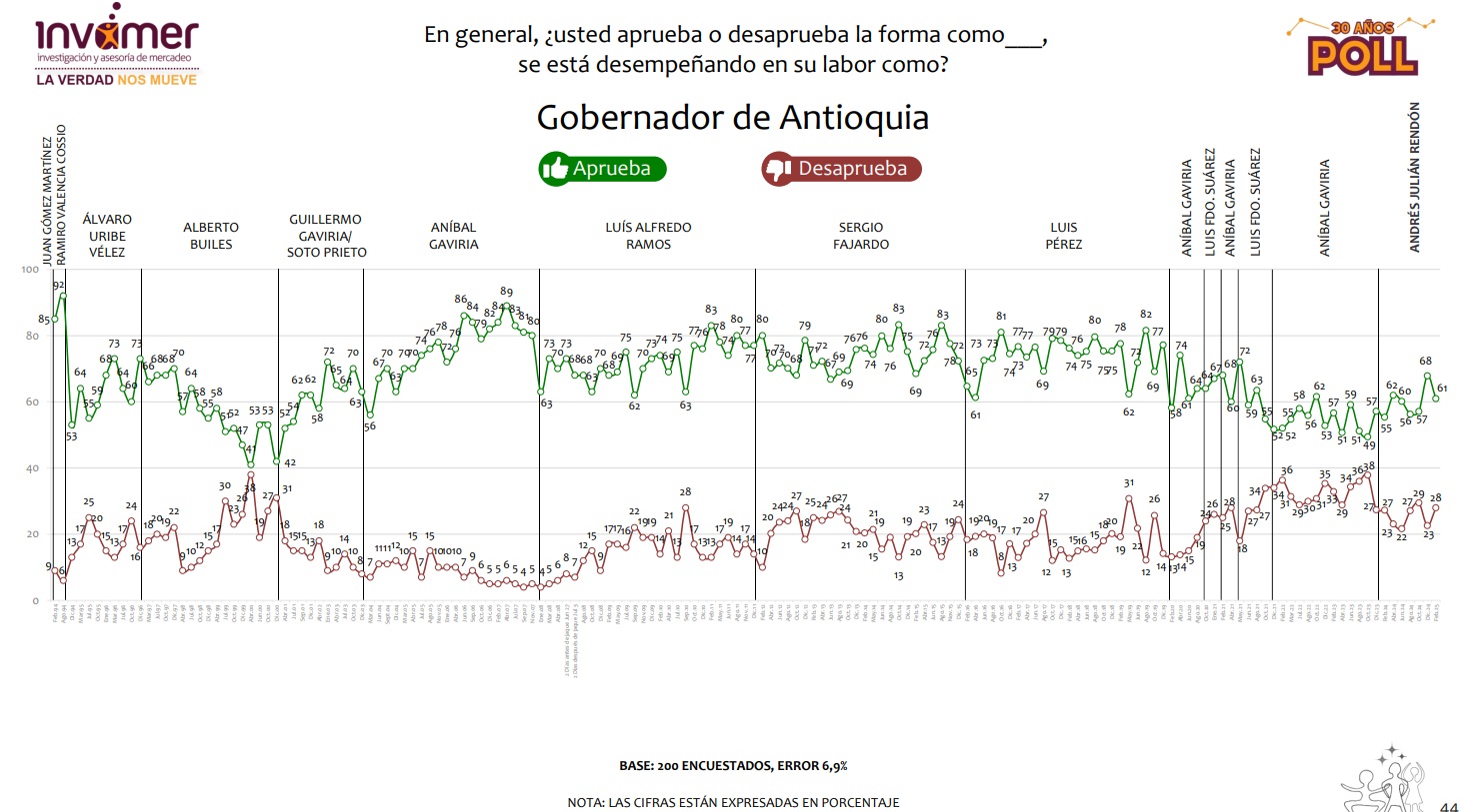 Lo más preocupante para el actual mandatario es que, sin contar el último año de Aníbal Gaviria que estuvo manchado por su periodo en prisión, Andrés Julián tiene la imagen más baja contando el registro de los últimos cinco gobernadores en Antioquia.