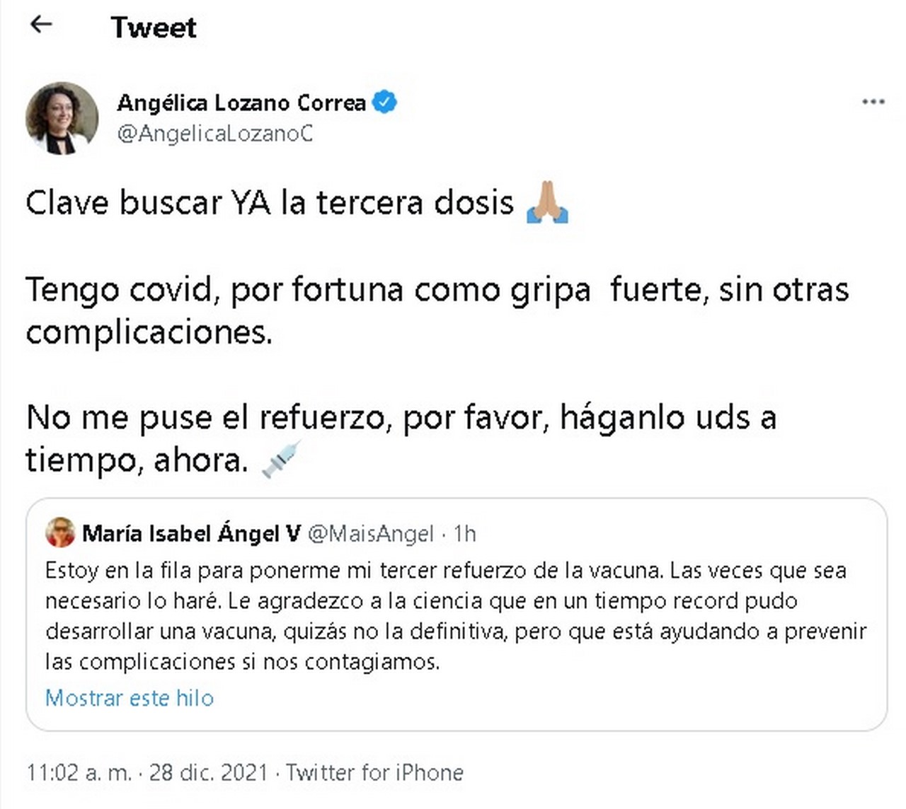 Asimismo, Lozano le hizo un llamado a la ciudadanía a ponerse la dosis de refuerzo (tercera dosis), pues afirma que ella no se la puso: “Clave buscar YA la tercera dosis. No me puse el refuerzo, por favor, háganlo uds a tiempo, ahora”, dijo.