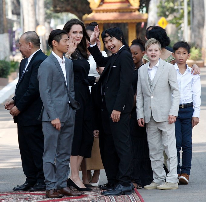 La actriz Angelina Jolie (c) y sus hijos saludan antes de entrar en el Palacio Real camboyano. Jolie ha viajado al país asiático para presentar su nueva película, “Primero mataron a mi padre: una hija de Camboya recuerda”, sobre el genocidio del Jemer Rojo. EFE