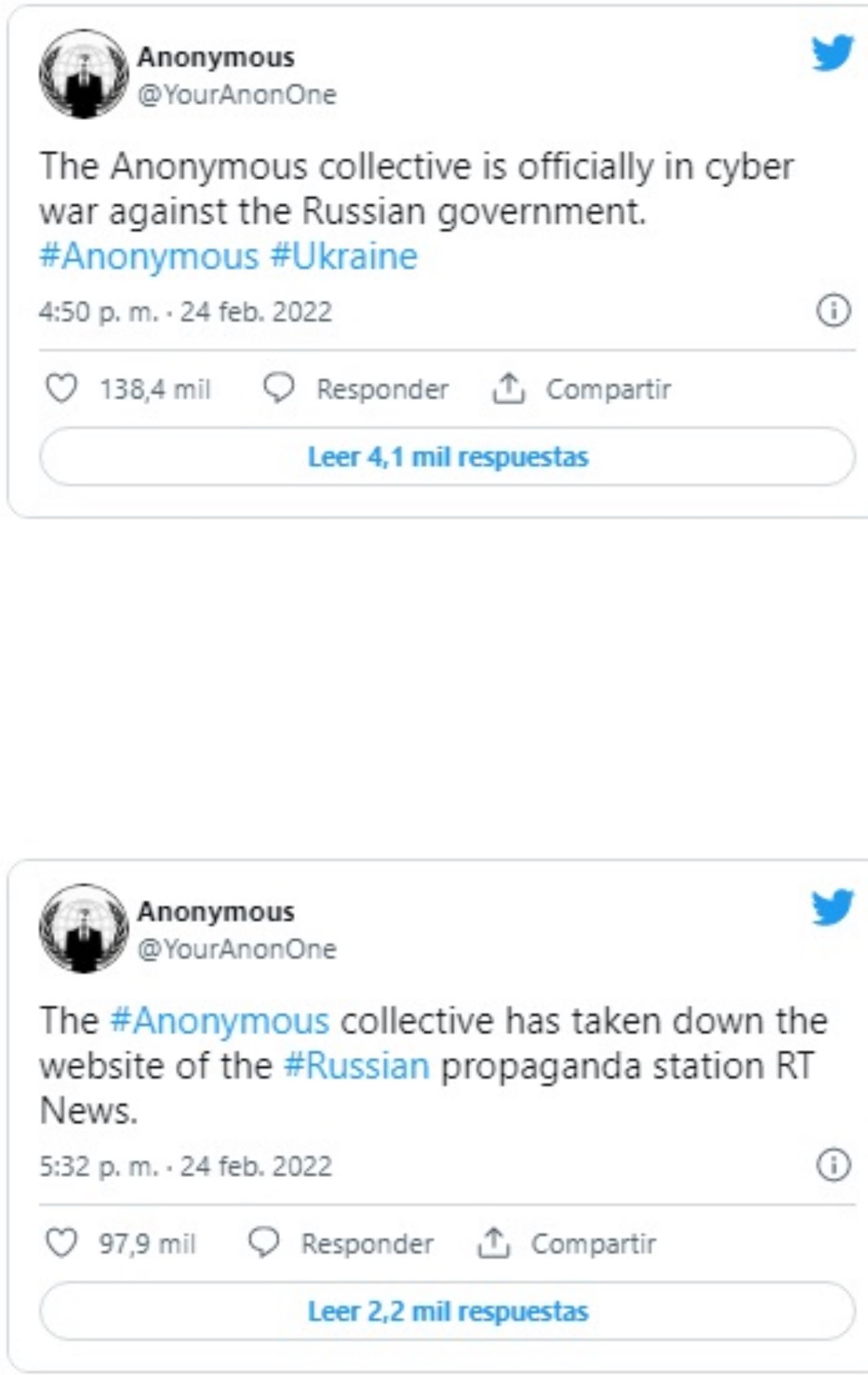 Por medio de las redes sociales Anonymous se atribuyó el bloqueo de los sitios web del canal RT en inglés y RT en ruso. “El colectivo Anonymous ha derribado el sitio web de la estación de propaganda rusa RT News”, anunció el tuit.