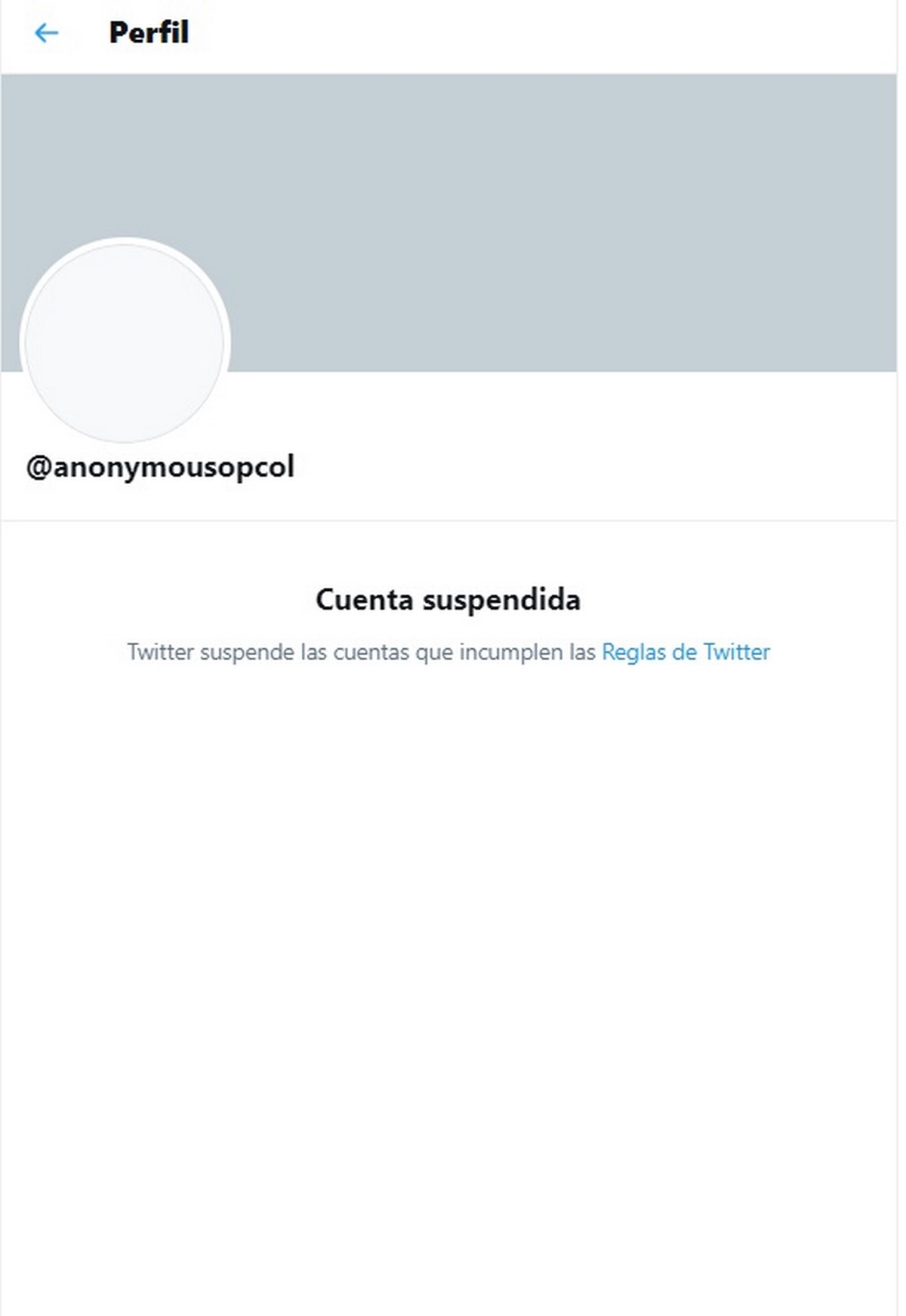 La suspensión, que opera de forma permanentemente, fue tomada contra el perfil @AnonymousOpCOL, y la medida se tomaron por la violación de las reglas de la plataforma “específicamente nuestra política sobre información privada”.