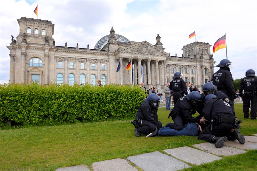 Hasta 1.000 antidisturbios se desplegaron en la Alexanderplatz berlinesa, aunque no hubo mayores incidentes. Sí actuó la policía, en cambio, ante el Reichtag (sede del Parlamento), donde se había concentrado un número mayor de personas de lo autorizado.