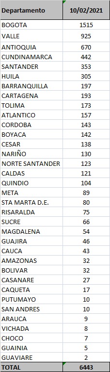 54.818 casos activoshttps://t.co/SiKTpTCQ3W pic.twitter.com/PJszInFtEH— MinSaludCol (@MinSaludCol) February 10, 2021