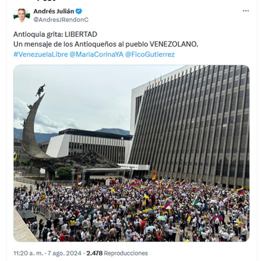 El gobernador Andrés Julián publicó a través de las redes sociales una imagen de la convocatoria acompañado por el texto: “Antioquia grita: LIBERTAD. Un mensaje de los Antioqueños al pueblo VENEZOLANO. #VenezuelaLibre @MariaCorinaYA”