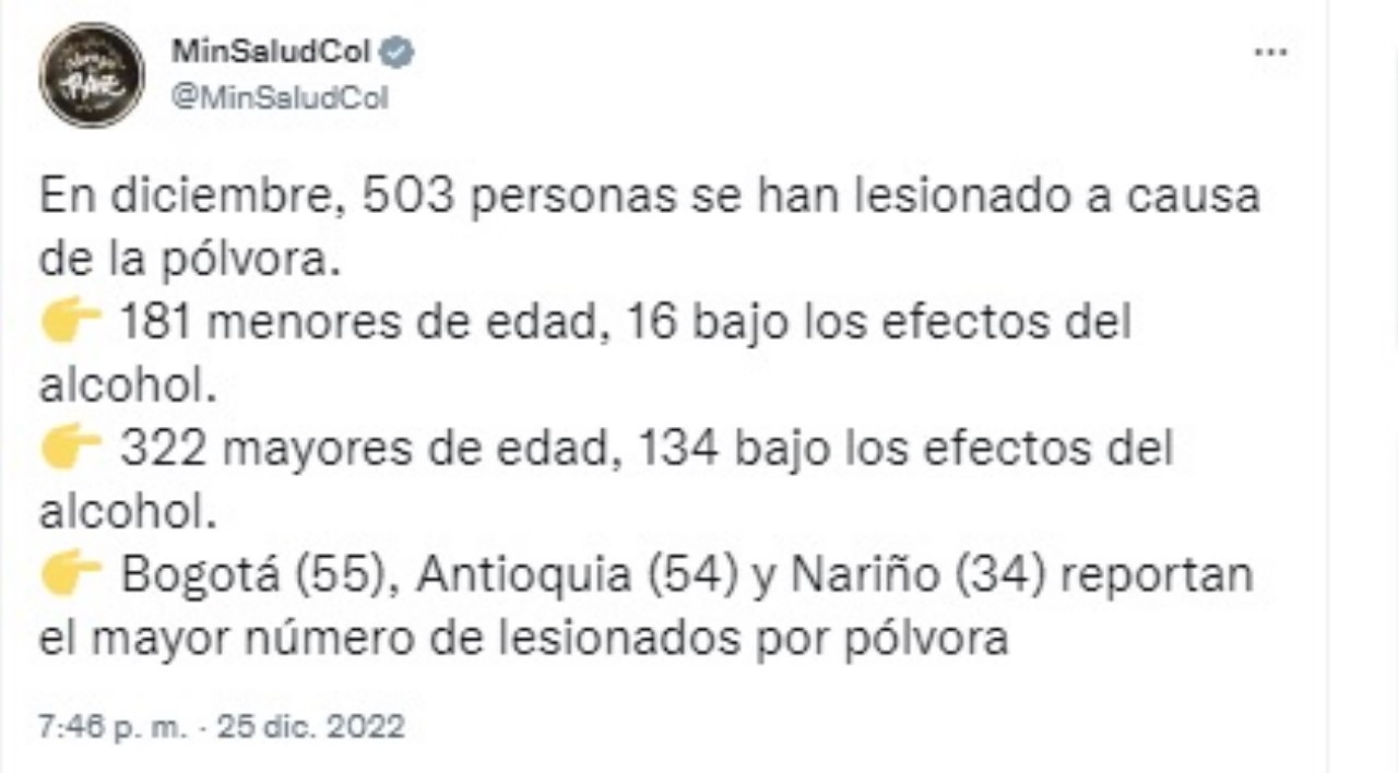 En el reporte de Minsalud, anunciaron que en diciembre, 503 personas se han lesionado a causa de la pólvora.