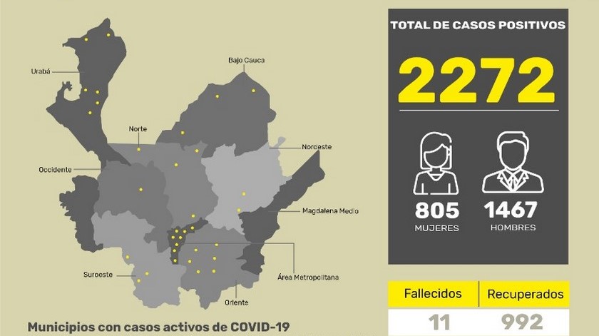 Todos estos nuevos contagiados fueron previamente identificados, puestos en aislamiento y bajo la vigilancia epidemiológica correspondiente. Con estos nuevos casos, la cifra de personas contagiadas en Antioquia se eleva a 2.272. De ellos 805 son mujeres y 1.467 son hombres.