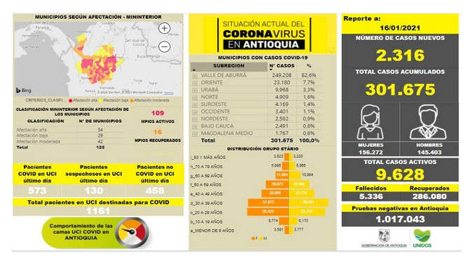 La Secretaría Seccional de Salud de Antioquia, para hoy sábado 16 de enero, reportó 2.316 casos nuevos registrados de Covid-19 en el departamento y una cifra de contagiados de 301.675.