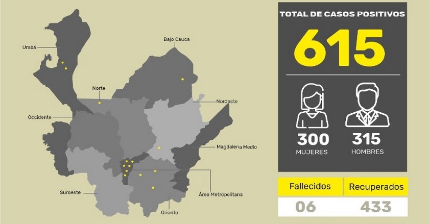 El informe indica que, a la fecha, hay 176 casos activos en el departamento y la cifra de personas recuperadas asciende a 433. De los activos, en Medellín hay 112 casos y los 64 restantes están distribuidos así en los siguientes municipios: Ituango (28), Bello (4), Apartadó (7), Copacabana (4), Envigado (2), Cisneros (1), Itagüí (3), El Bagre (1), Turbo (4), Rionegro (1), Sabaneta (4), Marinilla (2), La Estrella (2) y El Carmen de Viboral (1).