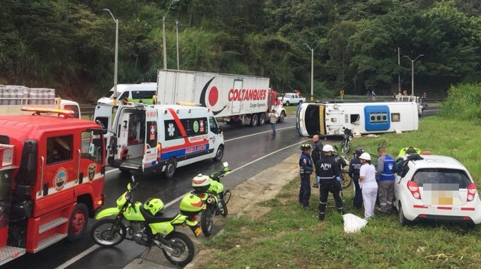Según el reporte de las autoridades, el vehículo de transporte público se volcó al perder el control en un derrame de Acpm que había en la vía. Tres personas viajaban a bordo del bus y solo una resultó con lesiones.