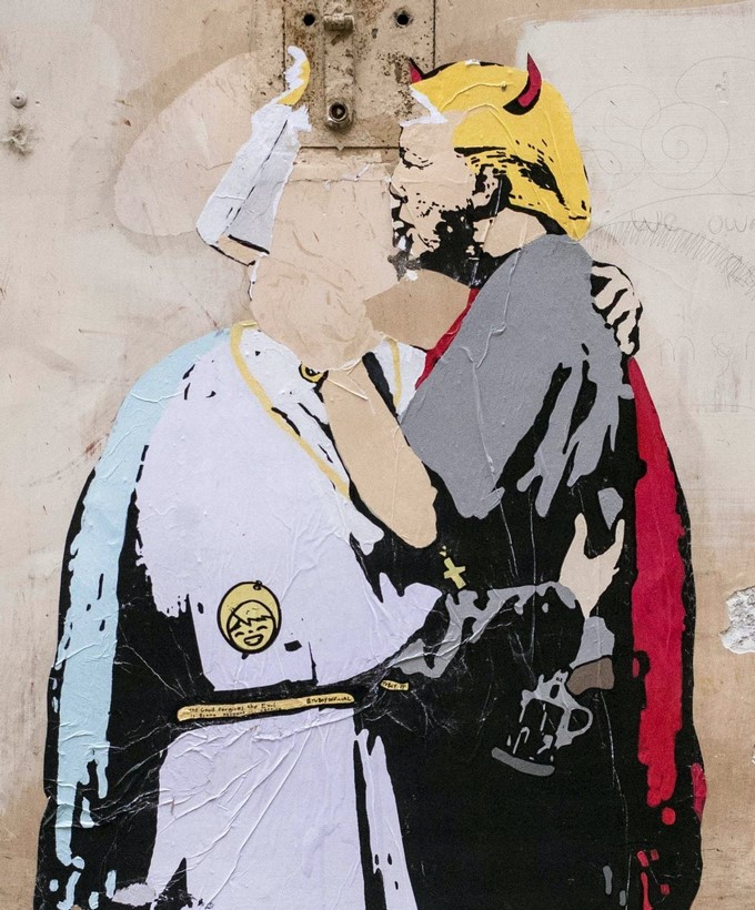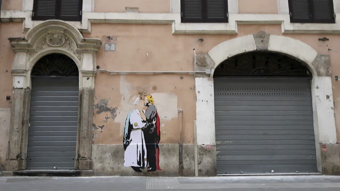 Aparece en el centro de Roma un dibujo del papa y Trump besándose