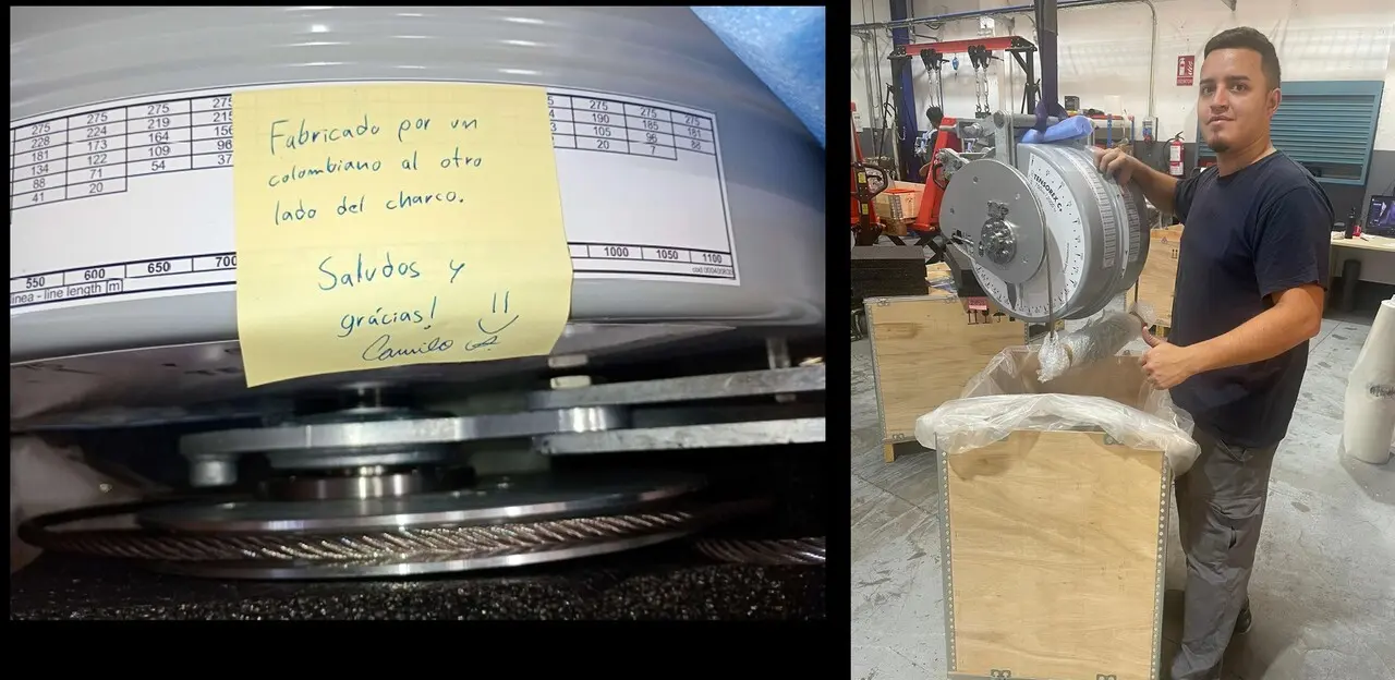 El proceso fue meticuloso. Camilo recibió el producto, aplicó los rigurosos estándares de calidad y, justo antes de sellar la caja, escribió la nota que hoy es viral. Esa caja viajó desde el Puerto de Barcelona, cruzó el Océano Atlántico durante 15 días hasta llegar a Cartagena, y finalmente subió las montañas antioqueñas hasta los talleres del Metro de Medellín.