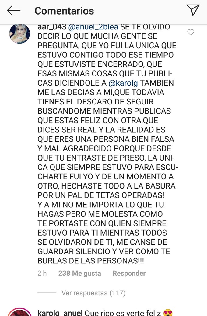 Mientras el cantante Anuel 2blea demostraba en un post de Navidad el amor hacia la colombiana Karol G, quien sería su expareja se dedicó a comentarle extensamente reclamando el tiempo que estuvo con él cuando se encontraba preso.