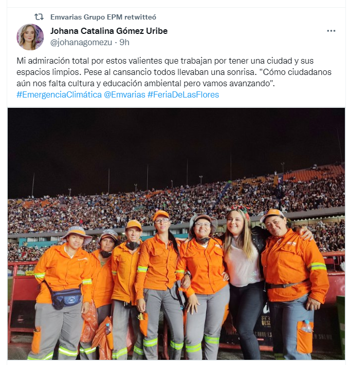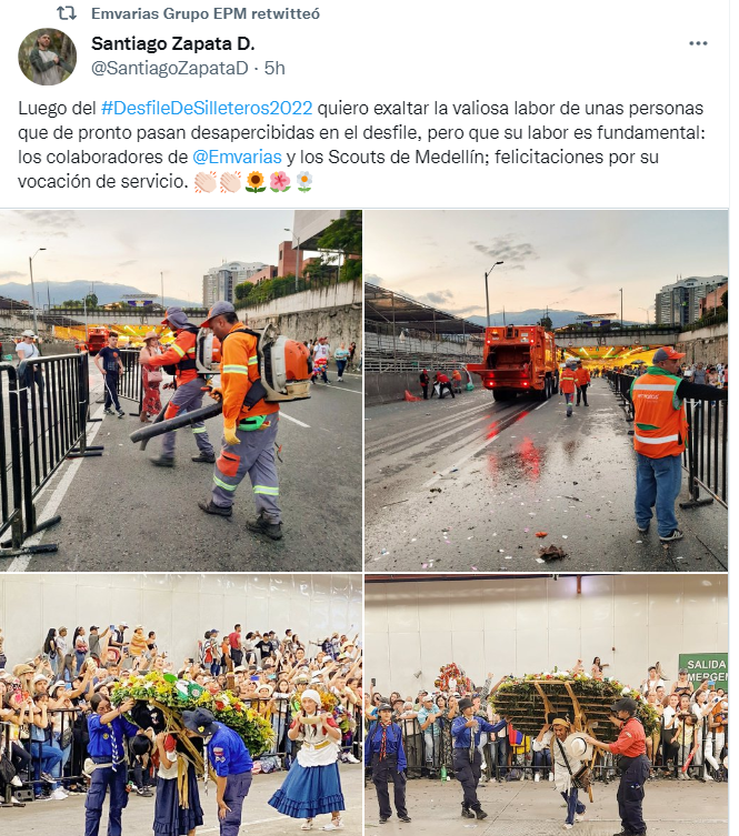 “Luego del Desfile de Silleteros quiero exaltar la valiosa labor de unas personas que de pronto pasan desapercibidas en el desfile, pero que su labor es fundamental: los colaboradores de Emvarias y los Scouts de Medellín; felicitaciones por su vocación de servicio”, escribió en Twitter Santiago Z.