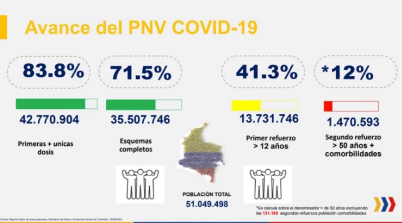 Destacó que se tiene un avance del 83,8 % en la aplicación de primeras dosis, 71,5 % segundas dosis, 41,3 % primeros refuerzos y 12 % de segundos refuerzos para población mayor de 50 años.