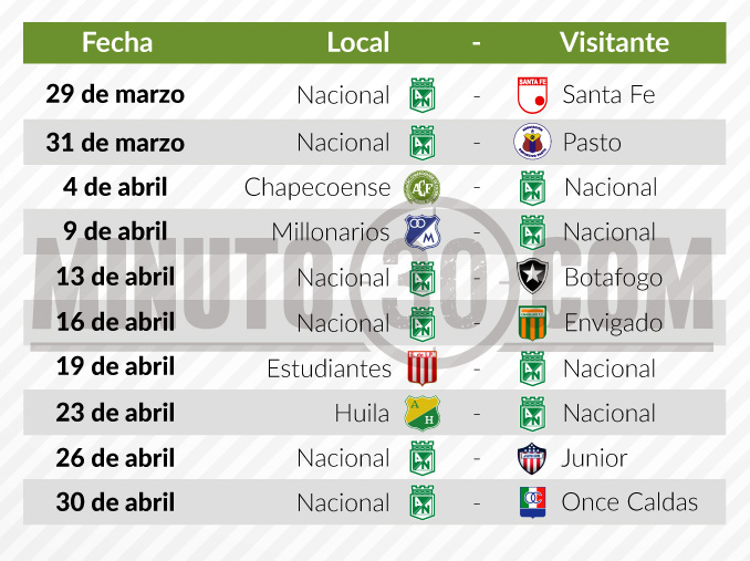 Lo anterior también obligó a la Dimayor a modificar la fecha de algunos de los juegos que estaban aplazados y por ende el ‘verde’ tendrá que jugar diez partidos entre el 29 de marzo y el 30 de abril.