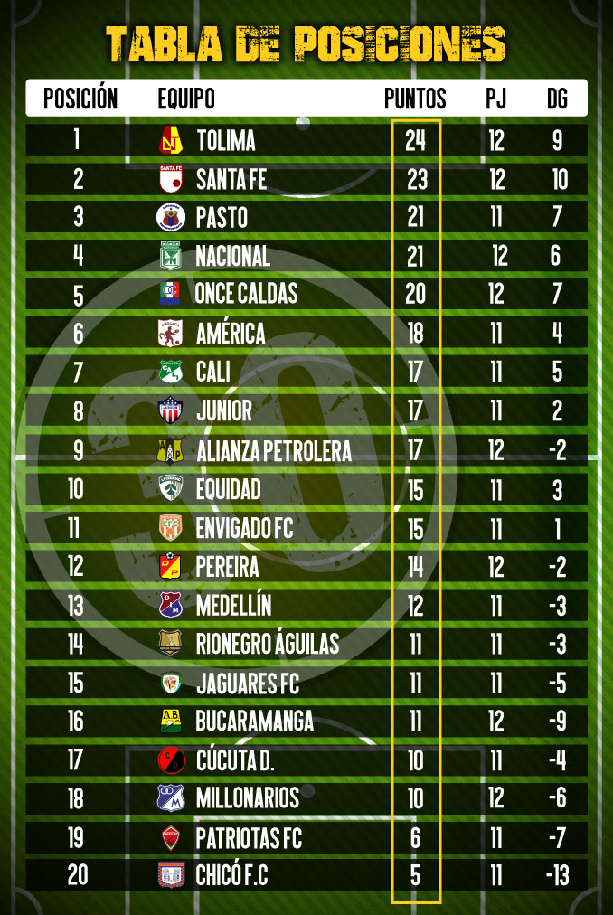 ‘El Pijao’ ocupa el primer lugar del escalafón, con 24 puntos; uno más que Independiente Santa Fe, que aparece segundo con 23, gracias a la imponente victoria que logró (4-1) ante Alianza Petrolera.