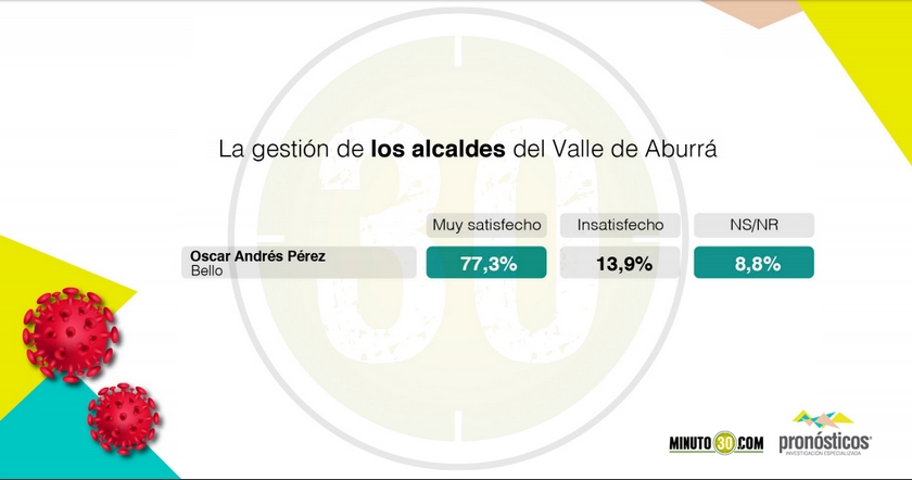 La firma encuestadora Pronósticos, bajo la resolución No 0690 DE 2018 del CNE, en asocio con nuestro portal Minuto30, realizó una encuesta en la que los ciudadanos del Valle de Aburrá evaluaron el manejo que los diferentes mandatarios. En esta ocasión, hablaremos de la perspectiva que tienen los habitantes sobre la gestión del mandatario de Bello, Óscar Andrés Pérez, quien ajusta poco más de cuatro meses en el cargo.