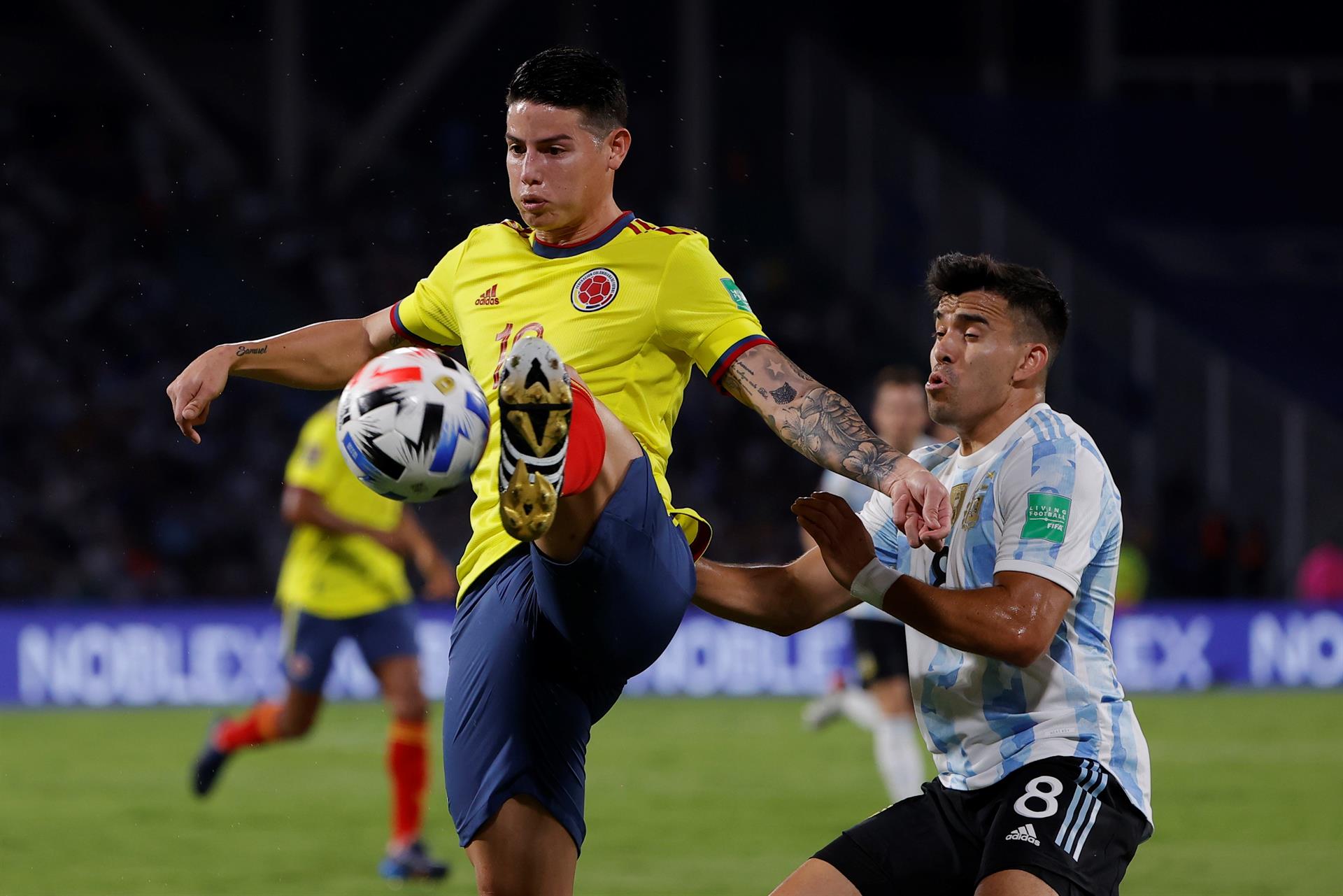 Marcos Acuña (R) de Argentina disputa un balón con James Rodríguez de Colombia durante las eliminatorias sudamericanas para el partido de la Copa Mundial Qatar 2022 entre Argentina y Colombia, en el estadio Mario Alberto Kempes en Córdoba, Argentina, este 1 de febrero de 2022. EFE/ Juan Ignacio Roncoroni