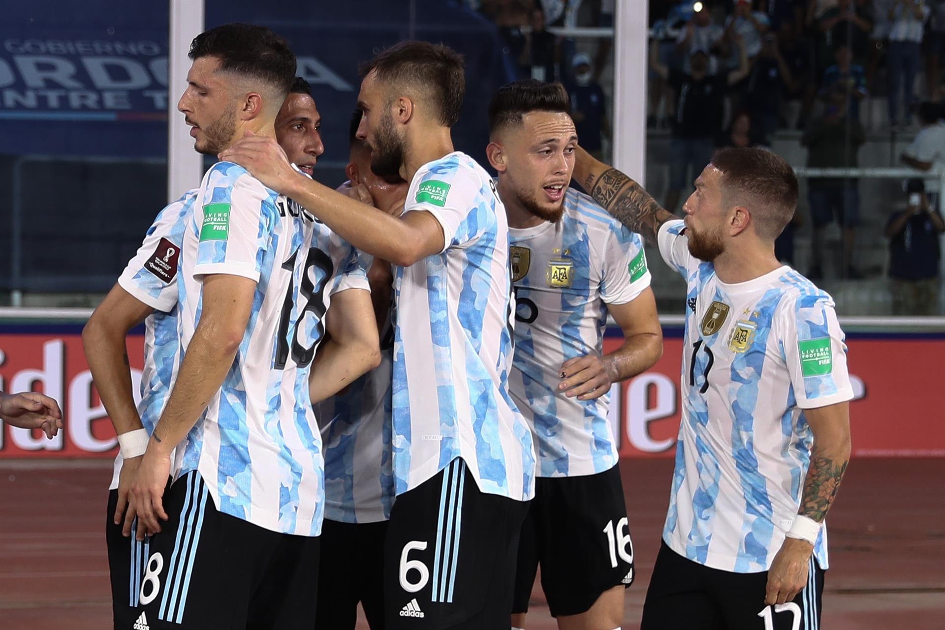 Jugadores de Argentina celebran un gol este 1 de febrero de 2022, en un partido de las eliminatorias sudamericanas para el Mundial de Catar 2022 entre Argentina y Colombia en el estadio Mario Alberto Kempes en Córdoba (Argentina). EFE/Juan Ignacio Roncoroni