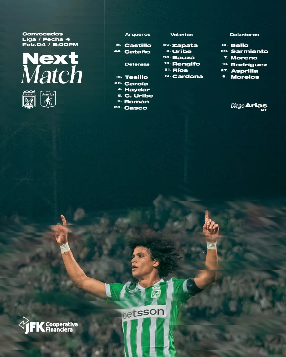 Resumen: Para el trascendental clásico ante América de Cali, que se disputará este miércoles 4 de febrero en un Atanasio Girardot colmado por más de 35 mil personas, el técnico de Atlético Nacional, Diego Arias, definió una convocatoria liderada por figuras como Edwin Cardona, Alfredo Morelos y Matheus Uribe. Ante la sensible baja de David Ospina por lesión, el arco será custodiado por 'Chipi Chipi' Castillo o Kevin Cataño, mientras que el frente de ataque contará con una amplia variedad de opciones como Marlos Moreno y Dairon Asprilla. Este encuentro representa apenas la segunda salida del conjunto "Verdolaga" en la Liga BetPlay, lo que aumenta la presión por conseguir los tres puntos en casa frente a su histórico rival