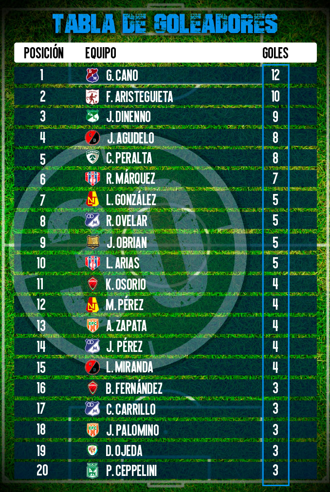 Deportivo Cali ya había jugado el partido correspondiente a esta jornada y por ende su delantero, Juan Ignacio Dinenno, se quedó en 9 goles.