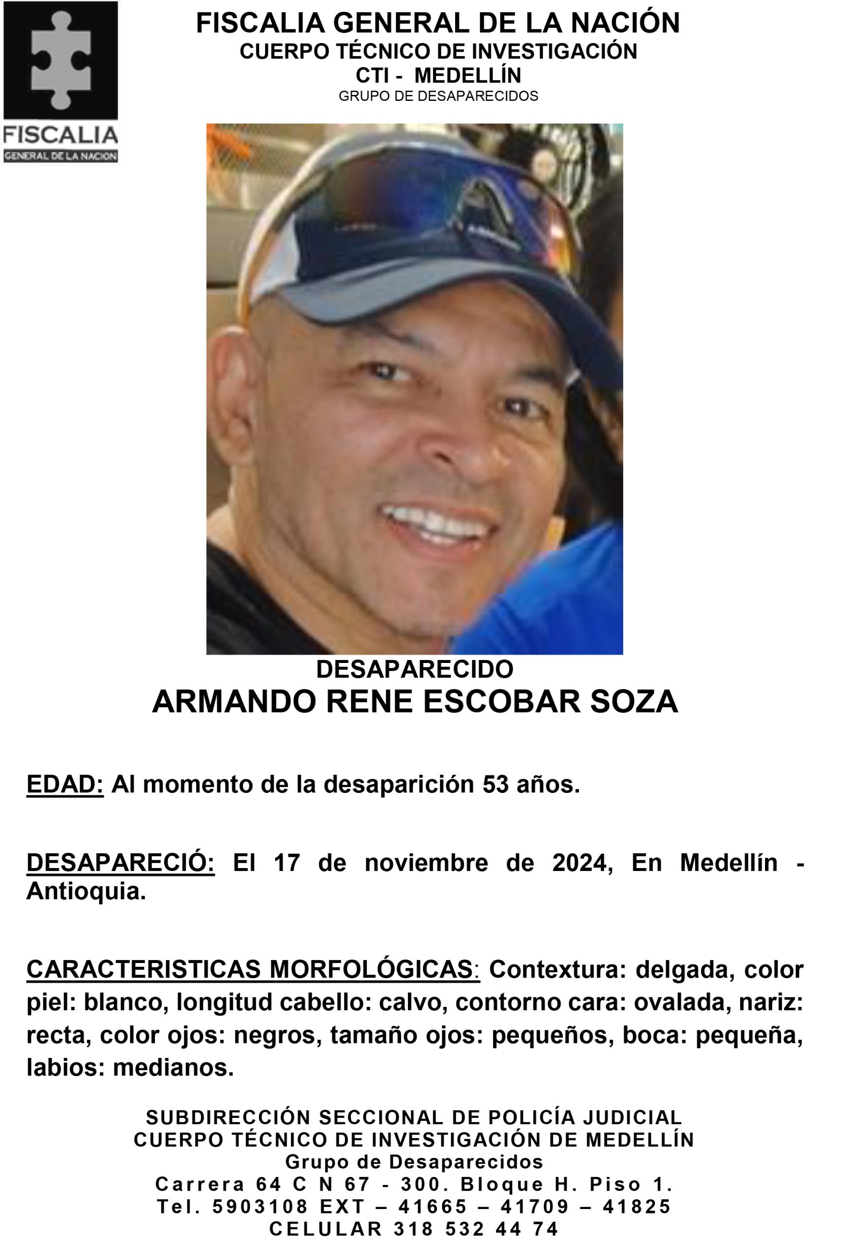Armando René Escobar Soza, de 53 años, desapareció el 17 de noviembre de 2024 en Medellín, Antioquia. En el momento de su desaparición, tenía una contextura delgada y su piel era de tono blanco.