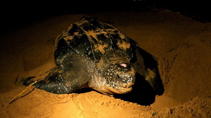 Una tortuga laúd anida en la playa de Fajardo, en Puerto Rico