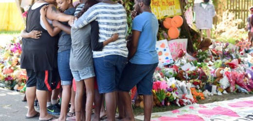 Un grupo de personas se consuelan mutuamente, mientras asisten a una ofrenda floral cerca de la casa en la que ocho niños fueron apuñalados hasta la muerte en el suburbio de Cairns Manoora, Australia. EFE