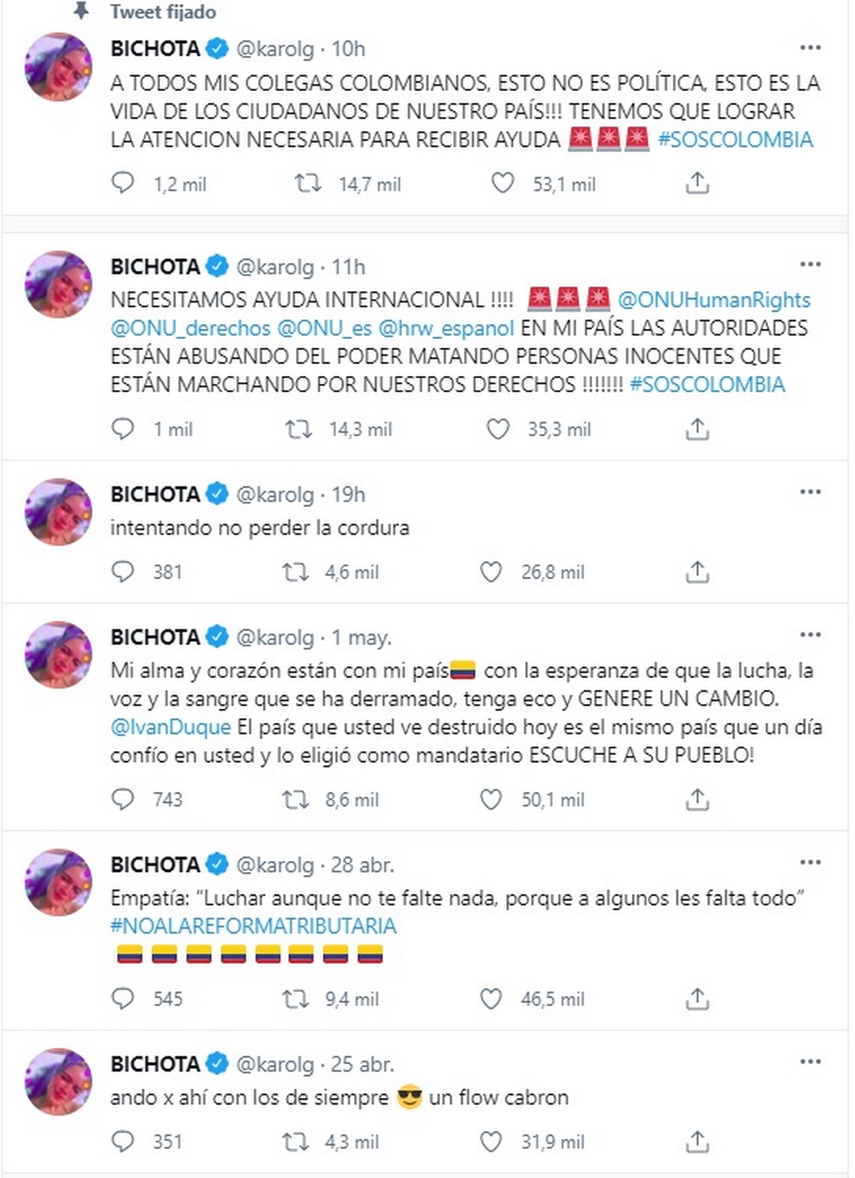 “Necesitamos ayuda internacional!!!! En mi país las autoridades están abusando del poder matando personas inocentes que están marchando por nuestros derechos!!!!!!! #SOSCOLOMBIA (SIC*)”, expresó Karol G en su cuenta de Twitter.