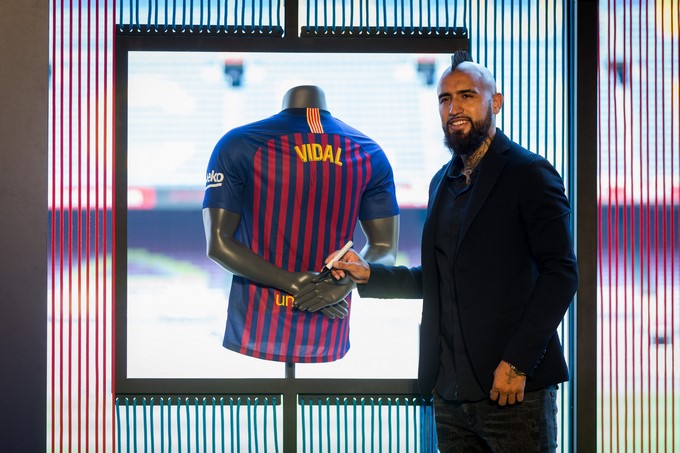 Después de rubricar el contrato, Arturo Vidal, que hoy lucía una fina cresta en la cabeza rapada, posó ante las dos camisetas del equipo y se dirigió a la platea para la presentación oficial.