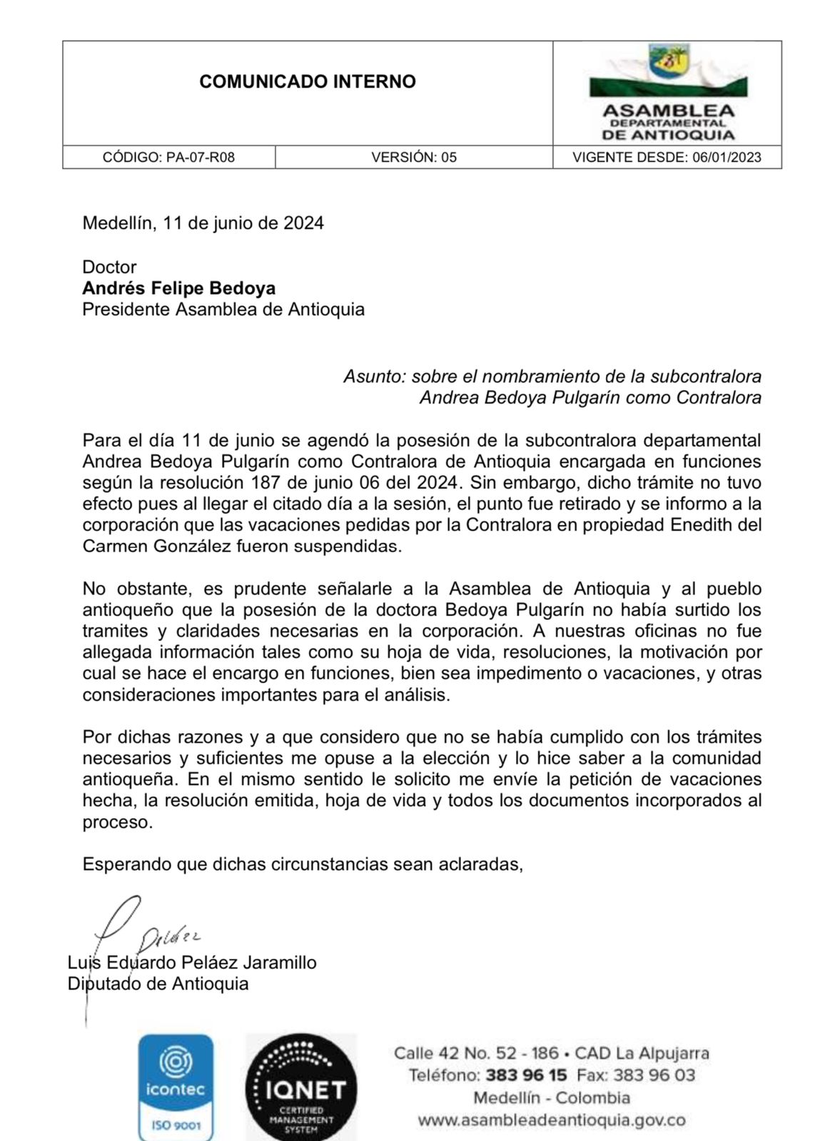 Por otro lado, el Diputado de Antioquia, Luis Eduardo Peláez Jaramillo, solicitó al Presidente Asamblea de Antioquia, Andrés Felipe Bedoya, la petición de vacaciones hecha, la resolución emitida, hoja de vida y todos los documentos incorporados al proceso de la Contralora de Antioquia, esto con la intención de dejar claro el asunto.