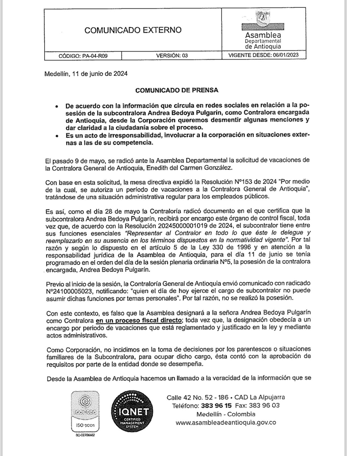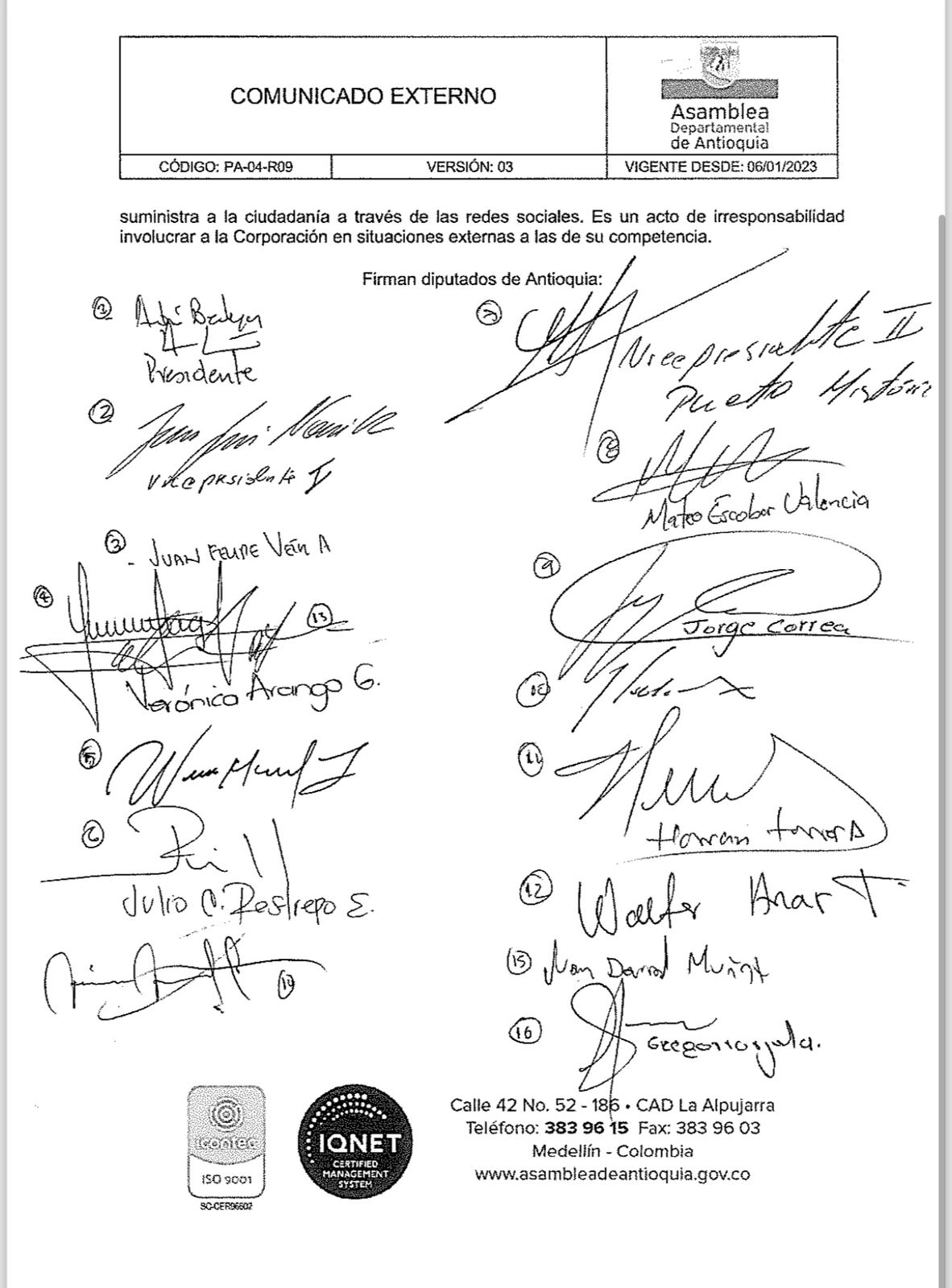 Se adjunta el comunicado completo de la Asamblea Departamental de Antioquia.