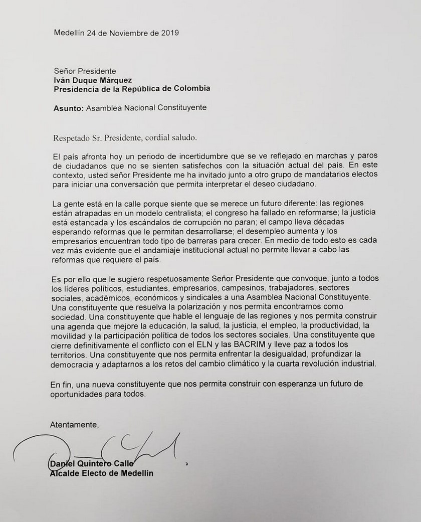 Luego de que el presidente de Colombia, Iván Duque, hiciera un llamado a los nuevos mandatarios del país, el alcalde electo de Medellín, Daniel Quintero, le envió una carta en la que invitó a considerar la idea de hacer una nueva Asamblea Nacional Constituyente, que permita ayudar a disminuir las brechas sociales que actualmente atraviesa la nación.