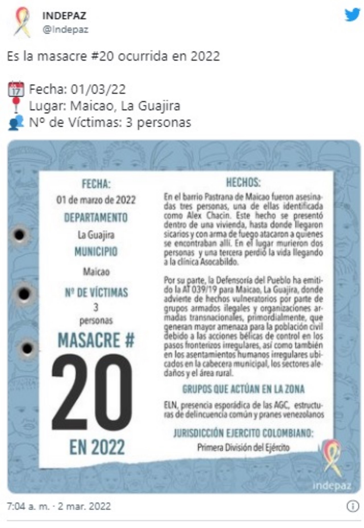 Esta es la masacre número 20 en lo que va del 2022 en Colombia, de acuerdo con la publicación de Indepaz.