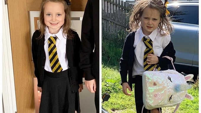Lucie vive en East Renfrewshire, Escocia. En la primera foto aparece feliz, pulcra y bien peinada. Sin embargo, cuando Lucie salió del colegio, su madre del tomó una foto con el cabello totalmente revuelto, el uniforme y mal puestos.