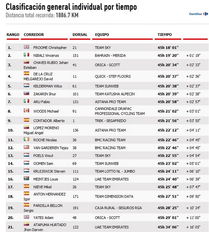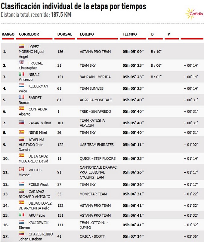 En la general, Froome sigue al frente con 1.19 minutos sobre Nibali y 2.33 respecto al colombiano Esteban Chaves. López ascendió a la décima casilla.