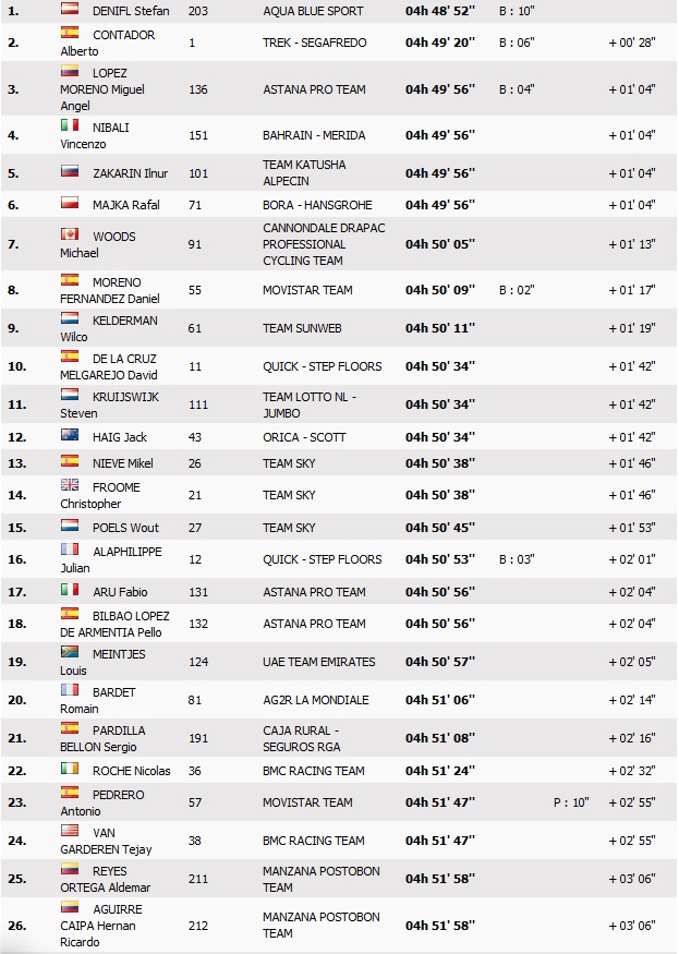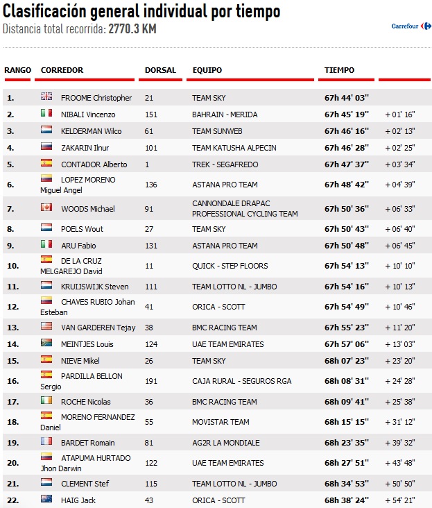 Por su parte, Esteban Chaves descendió a la duodécima casilla, mientras que Darwin Atapuma se mantuvo en la vigésima plaza.