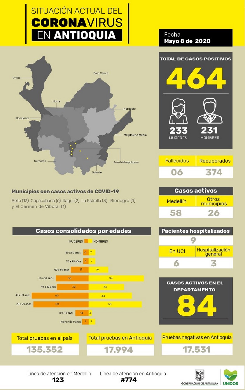 El informe para este 8 de mayo señala que en el departamento de Antioquia se registran cuatro casos nuevos de Covid-19, todos identificados previamente, aislados y en seguimiento epidemiológico. Con este nuevo reporte la cifra de casos positivos en el departamento asciende a 464. De ellos 233 son mujeres y 231 son hombres.