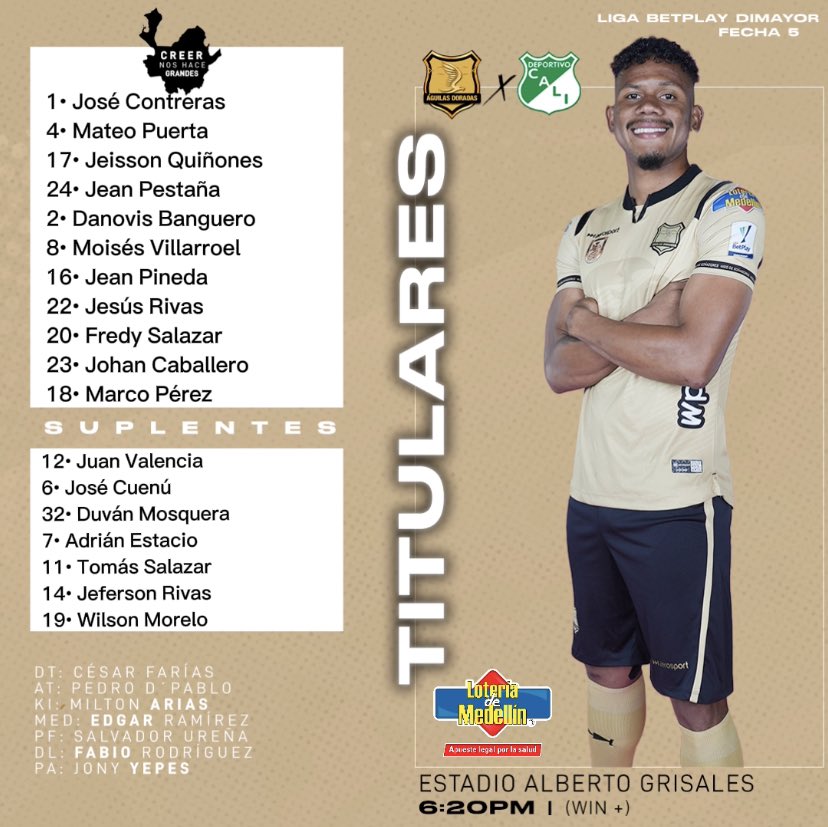 Águilas Doradas anunció el once titular con el que saltará al terreno de juego para enfrentar al Deportivo Cali y subirse a lo más alto de la tabla de posiciones de la Liga BetPlay II-2023