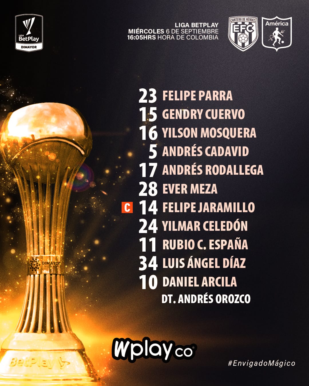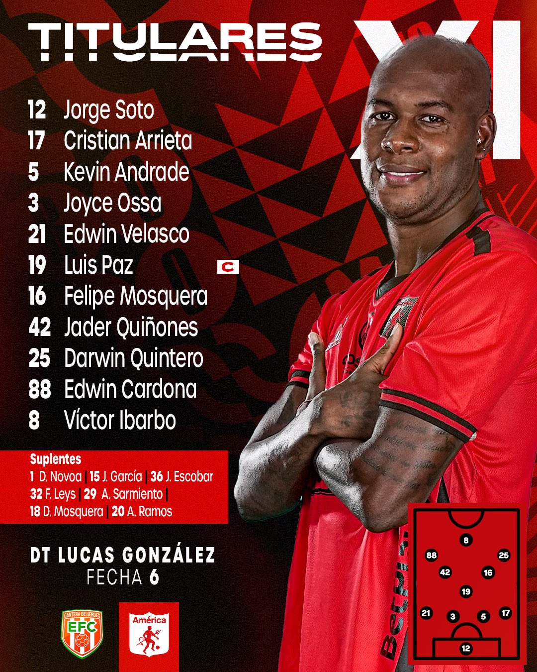 El América de Cali jugará con Jorge Soto, Cristian Arrieta, Kevin Andrade, Joyce Ossa, Edwin Velasco y Luis Paz.
