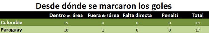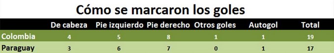 El 42% de los goles convertidos por Colombia son disparados con el pie derecho y el 100% son remates dentro del área. Mientras que Paraguay sólo ha marcado 1 gol por remates fuera del área y el 53% de ellos en el segundo tiempo.